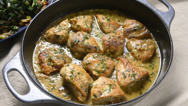Rachael Ray makes dijon-tarragon chicken, mashed potatoes with brie or camembert and rainbow chard with bacon and leeks.