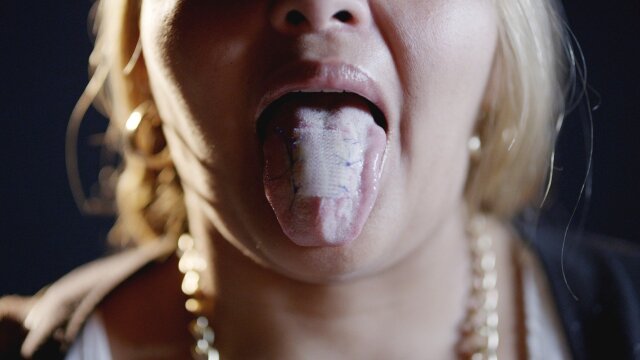 A surgically implanted tongue patch prevents tasting food; a high-tech device allows couples to receive pleasure together while in separate places.
