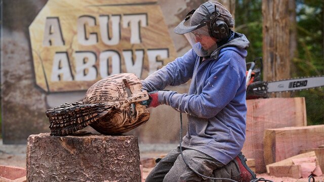 The carvers put on a fashion show with wearable wooden helmets modeled by host Adam Beach; the carvers travel back in time to create a piece that demonstrates gradual transformation.