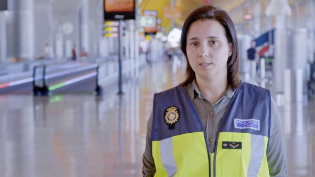 Un ciudadano español recién llegado de Colombia es apartado por los oficiales de estupefacientes para un control más exhaustivo luego de un entrevista de rutina.