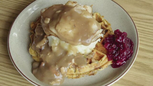 Duff Goldman finds a burger between glazed doughnuts; a whole Thanksgiving feast inside a waffle inside Guy Fieri; Martha Stewart's unique salmon; Alton Brown, Valerie Bertinelli and Sunny Anderson demonstrate how to get crazy in the kitchen.