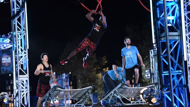 Travis Rosen and "The Phoenix" Najee Richardson join other ninja stars racing on the side-by-side obstacle course.