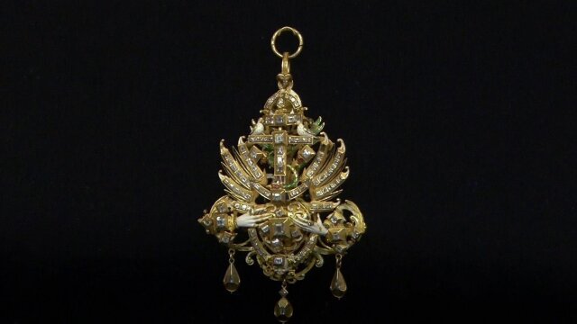 A 1907 Robert Henri oil painting; late 16th-century diamond marriage jewel; an English giltwood cabinet-on-stand.