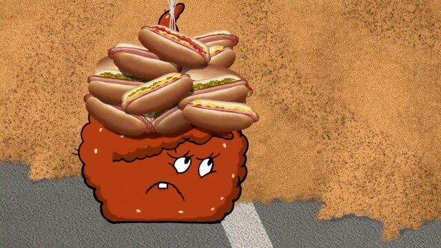 Shake and Frylock touch a huge cheeseburger.