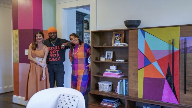 Natalie, Racheal and Frankie reimagine a white-on-white kitchen and family room for a family of four; preserving the bones of each space, they bring in bold color, original art and touches of glam to create a vibrant transformation.