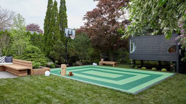 Love is large but space is tight for Lara & Mike and their 5 children. Brian and Sarah free up space by building an activity-packed tree house and recreation court for the children, with grilling, dining and lounging areas for the whole family.