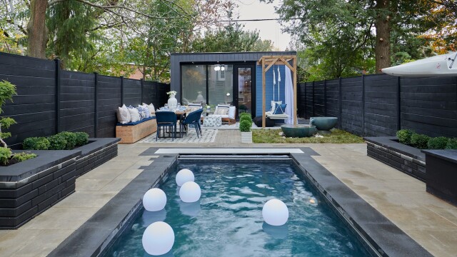Aarati & Dave both work from home, forcing their living room to be a triple duty working/living/childrens' play area. Brian and Sarah create a flexible structure, install a sleek and sophisticated plunge pool, and create an outdoor fireplace lounge.