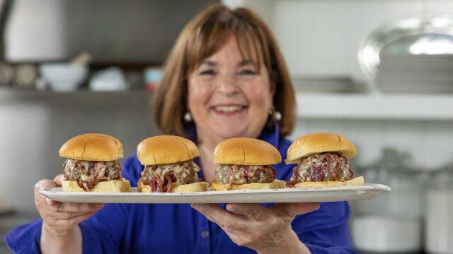 It's all about simple pleasures and four dishes that bring Ina Garten pure joy; she makes smashed hamburgers with caramelized onions, giant crinkled chocolate chip cookies, kielbasa with mustard dip and cheddar and chutney grilled cheese.