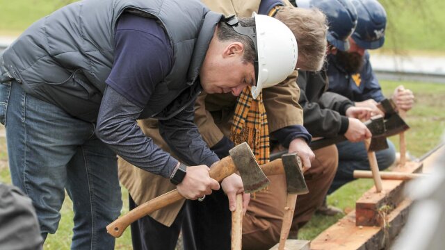 Mark donates a timber frame to West Virginia University, his alma mater, as an addition to its pioneer heritage center; the builders work with volunteers to raise the timber frame barn, teaching them how to build bents, cut pegs and hew logs.
