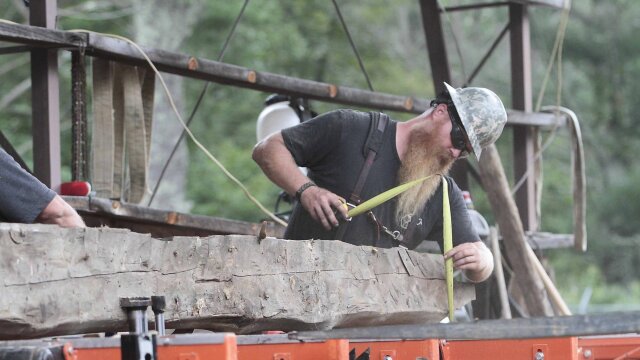 The crew restores two cabins and builds a barn door for their blacksmith shop; Mark Bowe scouts an old log cabin and drives through a river to visit the fishing cabin he and his crew built two years ago.