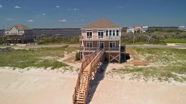 A duo is looking for a waterfront getaway in Topsail Beach, North Carolina, that has scenic ocean views, a fireplace and lots of living space to entertain their family.