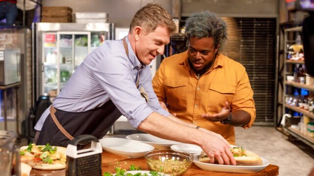 Damaris Phillips and actor JB Smoove are ready to get in Bobby Flay's face; they get help from chefs Christian Gill and Cecelia Valencia, who want to sandwich Bobby out of the kitchen.