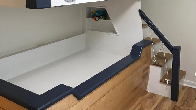 A family with a new baby is bursting out of their cramped bungalow in Bethany Beach, Del.; Marnie creates more space for the family by opening up the kitchen, relocating a laundry room and building magical bunk beds to accommodate the children.