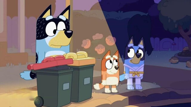 Muffin plays the game of library her way; Mum, Dad and Bingo must pass swim school; Bluey, Bingo and Dad always take out the bins.