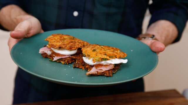 Bobby Flay uses leftovers to make a post-holiday brunch; gingerbread Dutch baby with poached maple pears and crème fraîche; sweet potato green onion pancake with holiday ham and pepper jam; grapefruit sparkle cocktail.