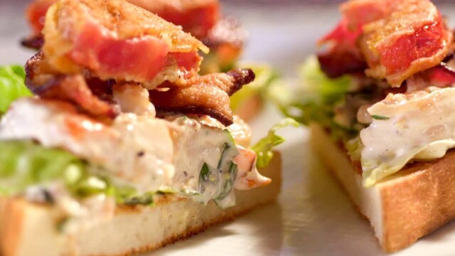 Bobby Flay and Beach Bites host Katie Lee throw a brunch for their guests; a cooling ginger beer margarita; deviled eggs with fried oysters; BLTs with fried tomatoes; roasted shrimp remoulade; corn cakes with crab and smoky avocado yogurt.