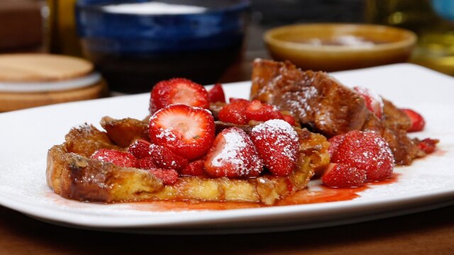Guest Sunny Anderson helps Bobby Flay with sweet brunch treats like creme brulee French toast with drunken strawberries, Sunny's sambal and pineapple glazed bacon, blueberry pancake bites and sparkling iced espresso.