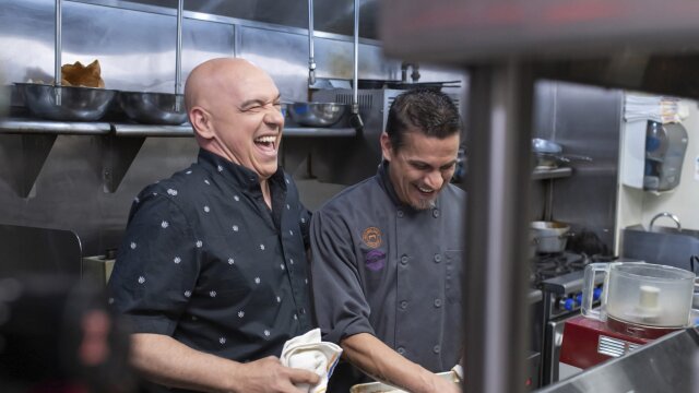Michael Symon starts in Las Vegas with a skillet full of pork belly chili and a mega-pancake; mac and cheese studded with crawfish, alligator andouille sausage and shrimp; an umami burger built for every craving.