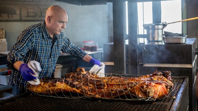 A whole pig on a super-sized indoor smoke pit; slow-smoked rib-eye steak sandwich complete with melted cheddar and caramelized onions; double beef patty burger that gets the royal treatment with two bacon grilled cheese sandwiches for buns.