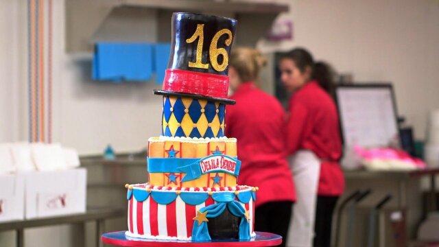 Creating a cake for the Tribeca Film Festival; popcorn-flavored filling; a longtime customer places a special order; baking a sweet 16 cake.