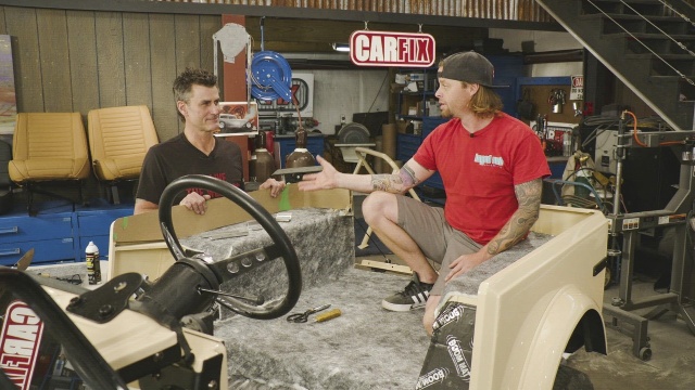 The guys bring in a vintage 1979 Jeep that is being sent to auction to give it a finished interior with carpet and panels; Jeremy uses a sewing machine to bind the carpet edges.