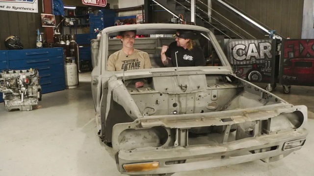 Fuller and Bumpus take a '70s Datsun truck and build a new rear frame section to lay frame on the ground; then to finish it off, they cut the roof and make it a convertible.