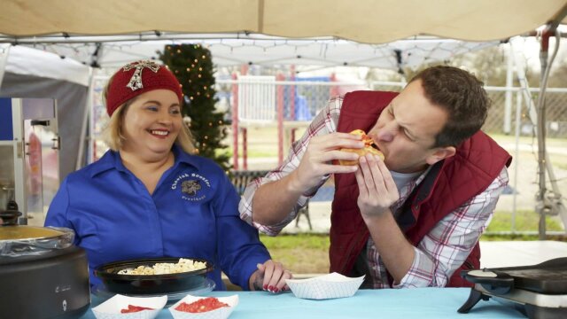 Midway eats, like the Onion Ring Nacho Supreme and Cosmic Funnel Cake at the Pasco County Fair in Florida; the Sights and Sounds of Christmas in San Marcos, Texas.