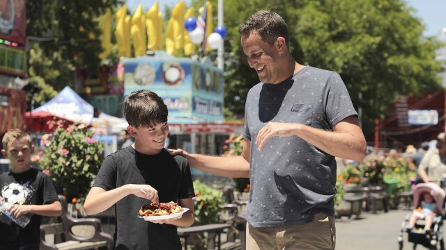 Noah starts the day at the Shasta District Fair in Anderson, Calif. by devouring Southern-style Biscuits 'n' Gravy Breakfast and a Cowboy Funnel Cake; he visits the National Balloon Classic in Iowa for an Iowa-only pizza.