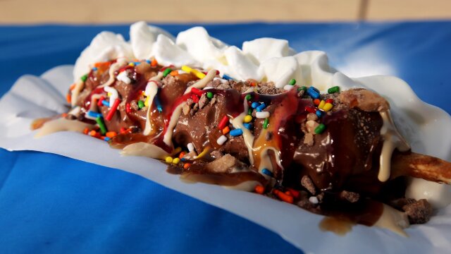 Fork-free and portable foods served on a skewer; Family Dog; Bacon Bomber; Gator Kabobs; Fudge Puppy.