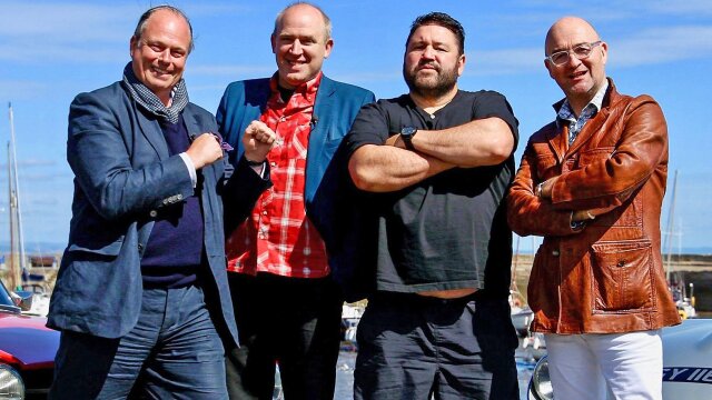 Comics Tim Vine and Ricky Grover search for profitable antiques in southeast Scotland; David Harper and James Braxton guide them; the teams gamble on a mahogany chair and pewter candlesticks.