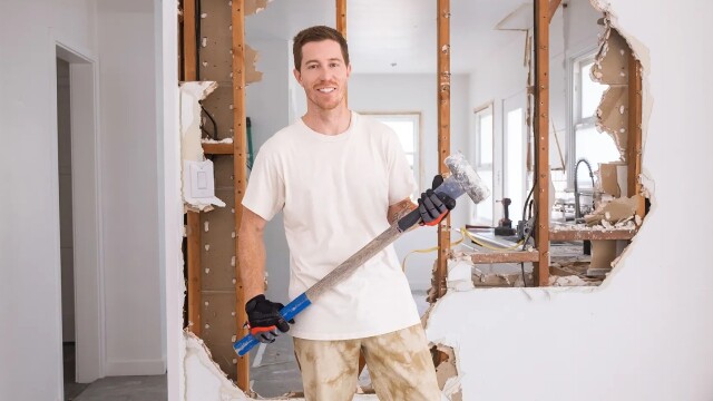Shaun White takes a break from the slopes to surprise his childhood best friend with a renovation of his new home; with Jonathan and Drew, the three upgrade the dated kitchen and living room to create minimalist sophistication.