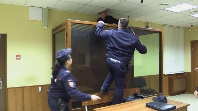 A Russian inmate tries to escape from a glass cage in court; a mother wails in agony as her teenage daughter receives a 20-year sentence.