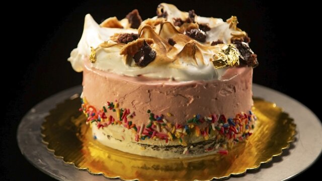 A birthday-themed competition; the chefs use popcorn and insect flour.