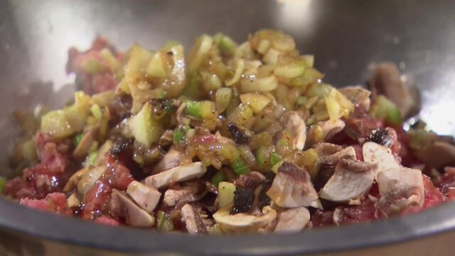 Truck stop chefs bring their own take on comfort food; in the first round, meatloaf mix and fennel; a purple veggie and a sweet drink are two of the ingredients in the second round; the final basket holds an apple pie.