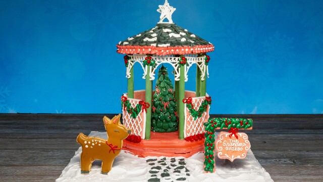 Ree Drummond and Eddie Jackson ask four competitive cookie makers to tackle two winter sports cookies; after the game, the cookie makers craft their own towering 10-foot tall Christmas gazebos where the merry residents of the North Pole can gather.
