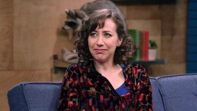 E9 | Kristen Schaal Wears Strawberry Colored Pants and a Multicolored Shirt