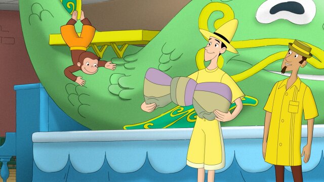 George meets Big John and offers to help him fix his catfish float for the big parade; George, Allie and the Man with the Yellow Hat visit their new neighbors and find that the old house has been made into a new hotel.