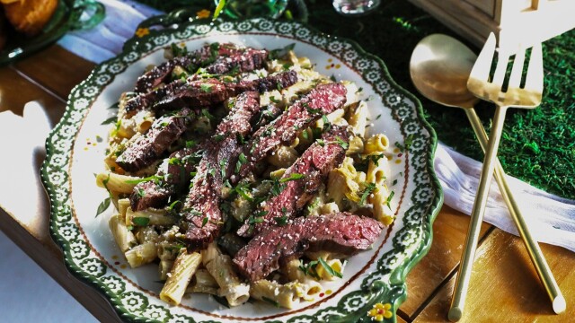 Kardea Brown throws a garden party for her girlfriends, showcasing locally grown ingredients; she prepares Creamy Leek and Steak Pasta, Low Country Style Shrimp Toasts with House Pickled Okra, Mixed Berry Crumble and White Sangria.