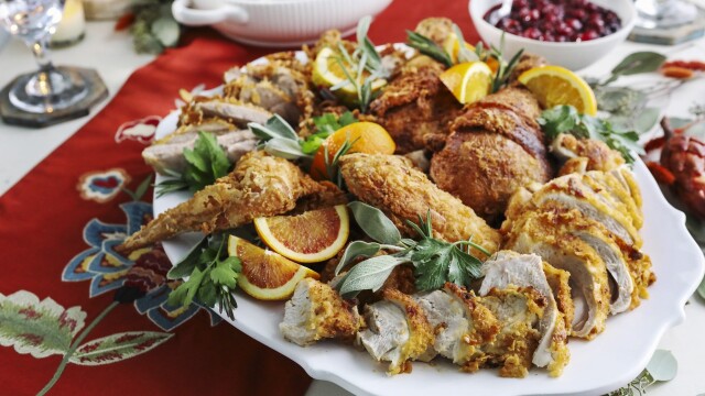 Kardea Brown hosts a big Thanksgiving meal with all the fixins'. She preps Chicken-Fried Turkey with Spicy Cranberry Sauce, Grandma's Old-Fashioned Baked Mac 'n Cheese, Cream of Collards and Georgia Peanut and Chocolate Slab Pie with Salted Whipped Cream.