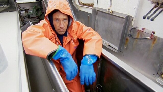 Mike works on a fish-processing boat in the Bering Sea, cleaning out the fish grinder; debarking, peeling and processing wood at the Rapid River Rustic Mill.