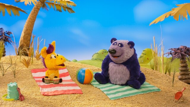 Donkey and Panda get frustrated when the sandcastle they are building at the beach keeps falling; Donkey tries to complete the Bobski Bounce Challenge.