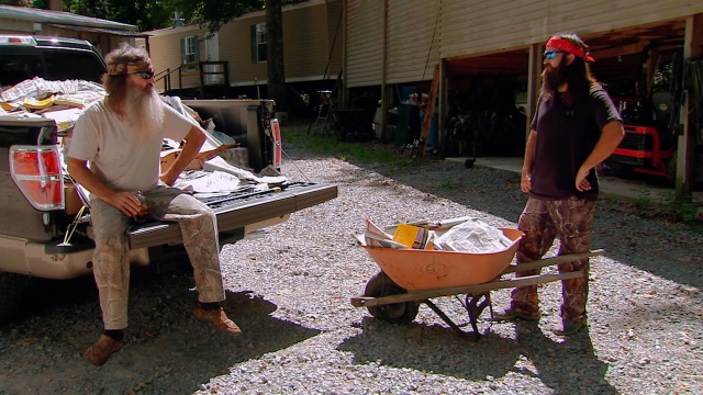 Willie and Jase compete to determine who can cook the better burger; a visit to the junkyard leads to quality bonding time for Phil and Jep; Jessica and Kay enjoy decoupage.