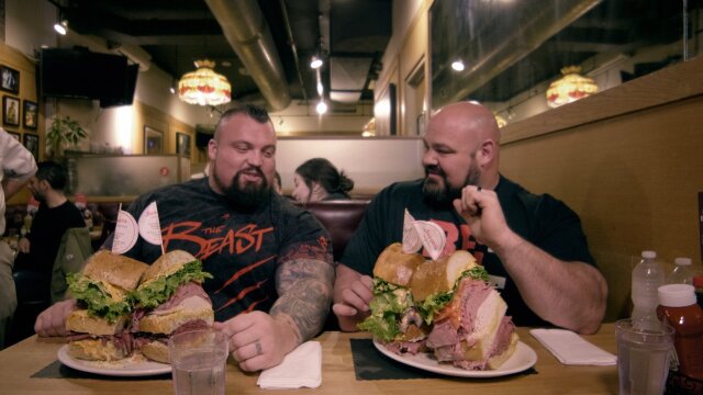 In Manhattan, Eddie Hall goes head to head with long-time rival Brian Shaw, pulling a 23-tonne truck and attempting the notorious skyscraper `Monster sandwich' from Sarge's Deli.