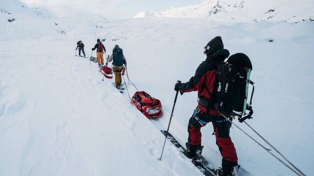Snowboarders Jeremy Jones and Elena Hight, and skier Griffin Post, venture out on a human-powered ski and snowboard expedition in the icy wilderness of Alaska's Glacier Bay National Park.