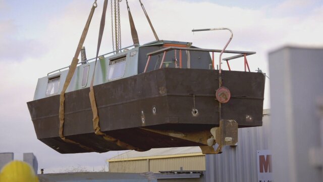 Dick and Angel buy an old canal boat and moor it in the moat for future guests; Angel discovers new wallpaper patterns while renovating the basement utility room; guests arrive via helicopter.