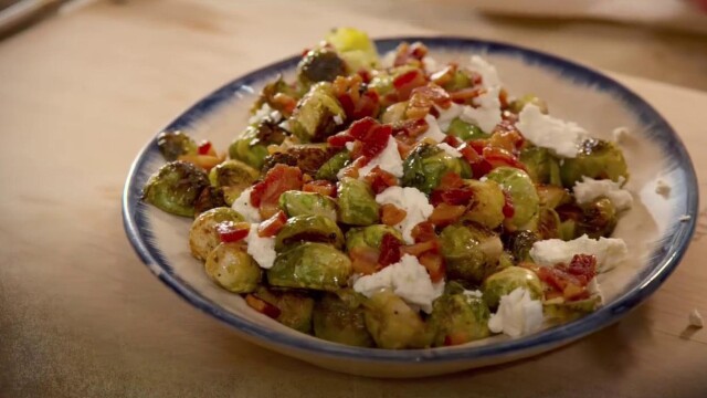 Fried brussels sprouts with pancetta and goat cheese; spaghetti and lamb meatballs; chopped caprese salad; lemon birthday bars.