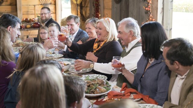 Nancy Fuller's family gathers at the farmhouse for another Fuller Thanksgiving; roasted and braised turkey with cognac gravy; root vegetable mash with thyme brown butter; pull apart butter rolls; pecan pie; bourbon cranberry cocktails.