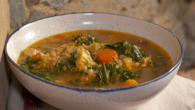 Nancy Fuller prepares a light and fresh menu for the new year; a get-up-and-go smoothie; chicken veggie soup with beef-bone broth; Nancy's friends join her for salmon with maple dijon glaze and roasted vegetable salad; dark chocolate nut bars.