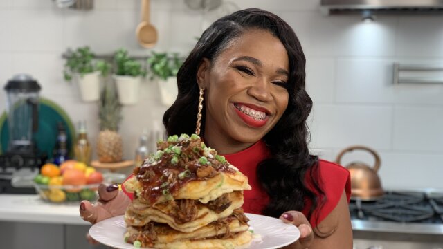 Danni Rose cooks pulled pork pancakes and fried pineapple rum milkshake; G. Garvin makes veal chops and a whiskey cocktail; Nyesha Arrington does potato tacos in spicy tomato sauce, and a blood orange paloma cocktail.