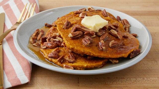 Katie Lee breaks out the blender for these comforting pumpkin spice latte pancakes made with cottage cheese and rolled oats.